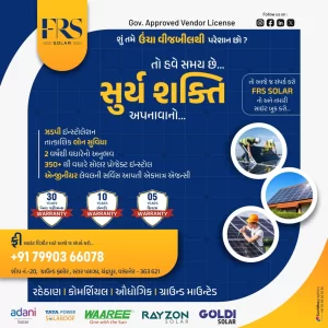 વાંકાનેર શહેર અને આજુબાજુના ગ્રામ્ય વિસ્તારોમાં ગ્રીન એનર્જીના ક્ષેત્રમાં અગ્રણી સોલાર કંપની FRS સોલાર દ્વારા છેલ્લા એક વર્ષ જેટલાં ટુંકા સમયમાં 350 થી વધુ સોલર રૂફટોપ સિસ્ટમના ઇન્સ્ટોલેશન પૂર્ણ કરી સોલાર ક્ષેત્રે જ્વલંત સફળતા મેળવી છે. ત્યારે આ સિદ્ધિને ધ્યાનમાં રાખી કંપની દ્વારા નવા ગ્રાહકો માટે ખાસ ઓફરની જાહેરાત કરવામાં આવી છે