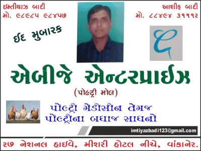 એબીજે એન્ટરપ્રાઇઝ ઈમ્તિયાઝભાઈ બાદી અને આશીફ બાદી સૌ મુસ્લિમ બિરાદરોને ઈદ મુબારક પાઠવે છે