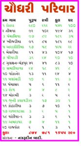 નીચે ચૌધરી પરિવારના ગામોના નામ, કુલ પુરુષ વસ્તી, કુલ સ્ત્રી વસ્તી, બંને જાતી મળીને વસ્તી અને કુલ ઘરની સંખ્યા આપેલ છે. આમાં વાંકાનેર, મોરબી અને રાજકોટ વસતા ચૌધરી પરિવારને પણ આવરી લેવામાં આવેલ છે. ઘરની સંખ્યા ધ્યાને લઈને ઉતરતા ક્રમમાં ગામોના નામો લખેલ છે. ચૌધરી પરિવારના વર્ષ 2014 માં કુલ ઘર 290 અને વસ્તી 1655 હતી, જેમાં પુરુષો 874 અને સ્ત્રીઓ 781 છે. યાદ રહે આ આંકડા વર્ષ 2014 ના એટલે કે આજથી નવ વર્ષ પહેલાના છે અને આંકડા ચૌધરી પરિવારે કરેલા સર્વેમાંથી લેવામાં આવેલ છે: