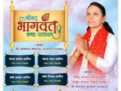 વાંકાનેરની કન્યા શાળા નંબર 4ના આચાર્યા અને શિક્ષિકા મીનાબેન રમણીકલાલ કાપડી આગામી મે 2026માં હરદ્વાર ખાતે શ્રીમદ્ ભગવદ્ કથાનું રસપાન કરાવશે. આ કથાનું આયોજન ગંગા કિનારે આવેલા વાસુદેવ આશ્રમમાં કરવામાં આવ્યું છે. વક્તા મીનાબેન કાપડી દ્વારા આપવામાં આવેલી વિગતો અનુસાર, આ શ્રીમદ્ ભગવદ્ સપ્તાહનું આયોજન 18 મે થી 24 મે 2026 દરમિયાન થશે. તેઓ વ્યાસપીઠ પરથી ભગવદ્ કથાનું રસપાન કરાવશે.