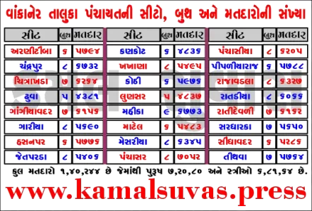 વાંકાનેર તાલુકા પંચાયતની કુલ 24 સીટ છે, જેમાં કુલ 1,40,244 મતદારો છે, જે પૈકી 72080 પુરુષ અને 68164 સ્ત્રી મતદારો છે 24 સીટ નીચે આવતા ગામડાઓ, તેના બુથ તથા મતદારોનો સંખ્યા નીચે મુજબ છે…